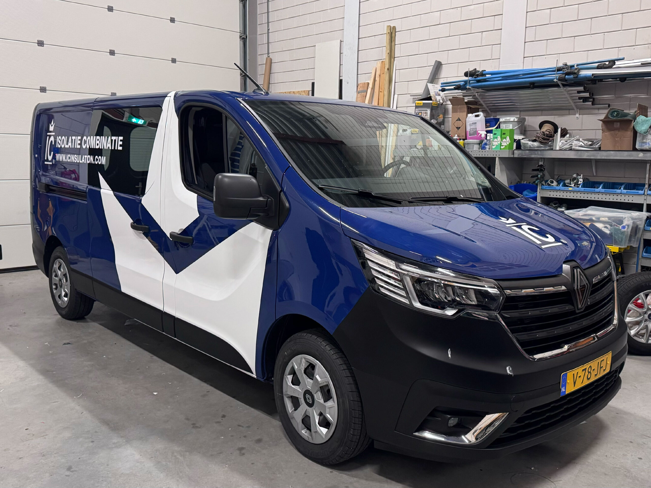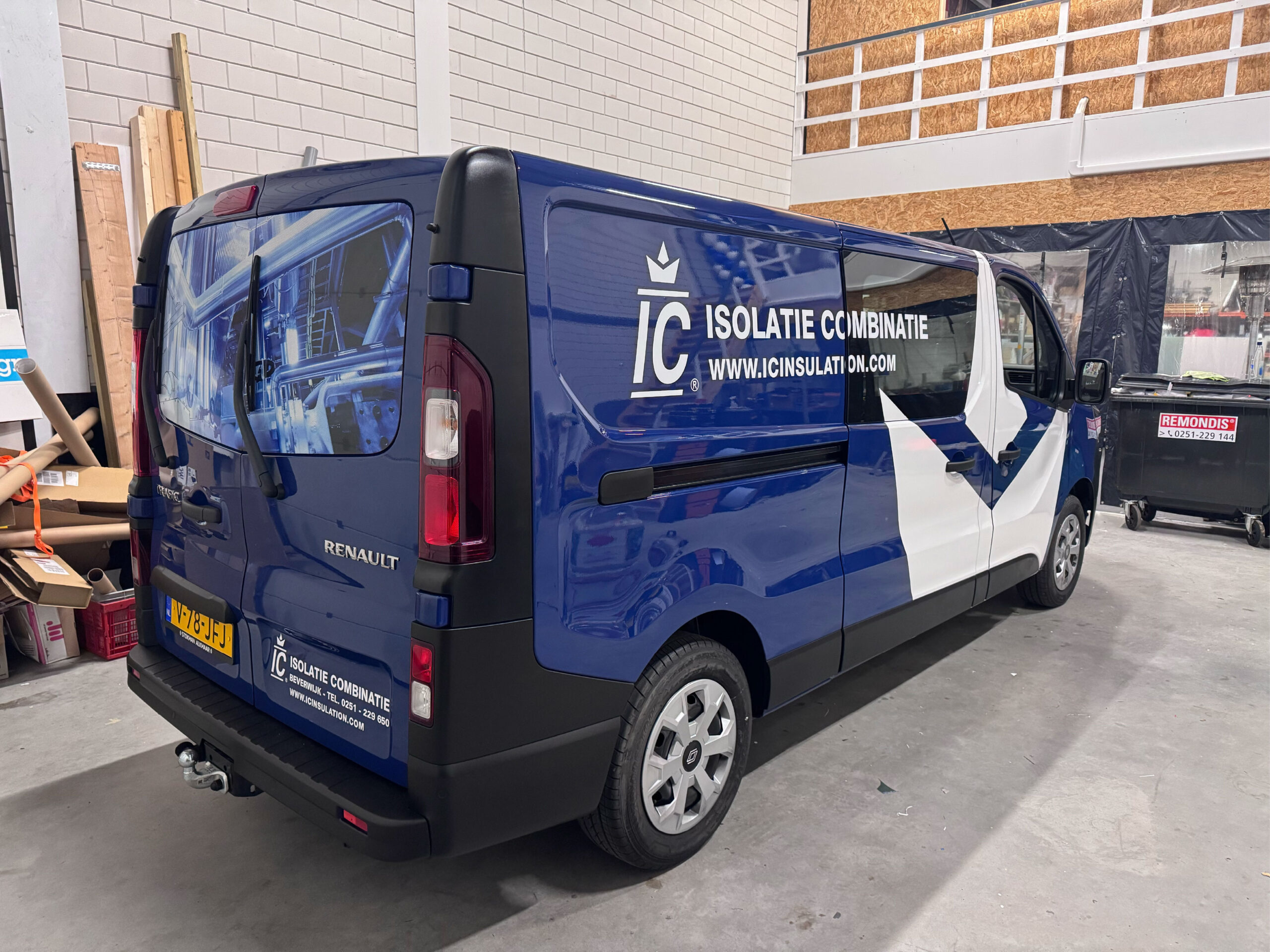 Voor Isolatie Combinatie Beverwijk hebben we een donkerblauwe bedrijfsbus voorzien van hun logo in een opvallende witte wrap, helemaal in lijn met hun vernieuwde branding. De witte wrap op donkerblauwe achtergrond, zorgt ervoor dat het logo en de reclame-uitingen perfect tot hun recht komen. Het ontwerp sluit naadloos aan bij de stijl van het bedrijf en maakt de bus tot een opvallende, professionele verschijning op de weg.